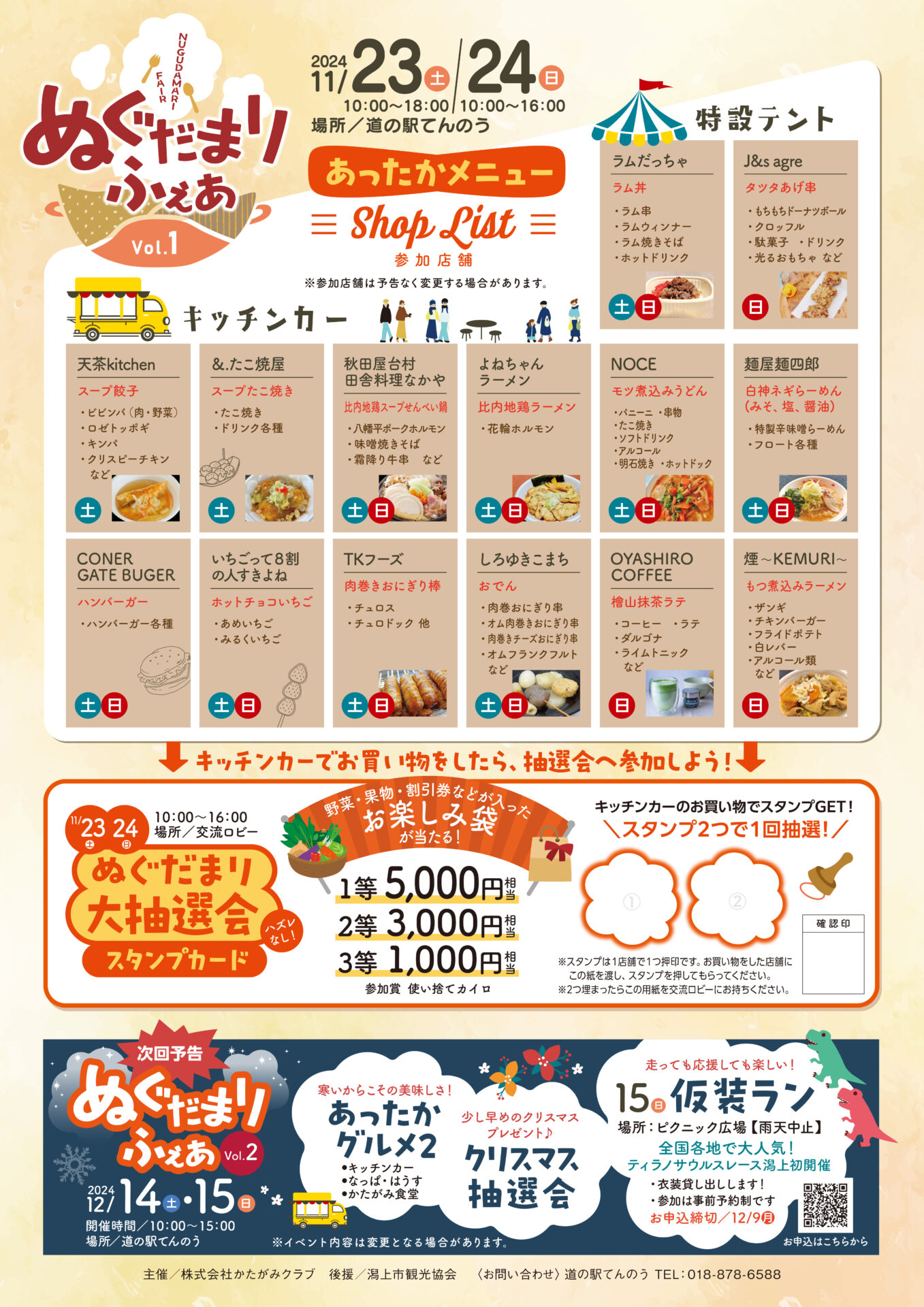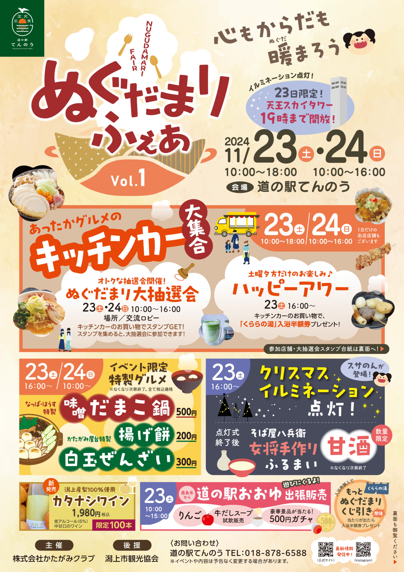 「心もからだも暖(ぬぐだ)まろう」をテーマに、道の駅レストランや人気キッチンカーのあったかメニューの提供や、「くららの湯」にお得に入浴できる特典など、他にも来客の皆様に楽しんでいただけるようなイベントを開催します🥳