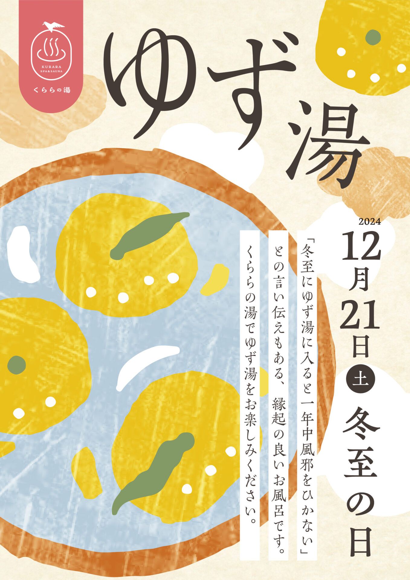2024年12月21日(土)冬至の日くららの湯ではゆず湯🍊を実施します!「冬至にゆず湯に入ると一年中風邪をひかない」との言い伝えもある、縁起の良いお風呂です。