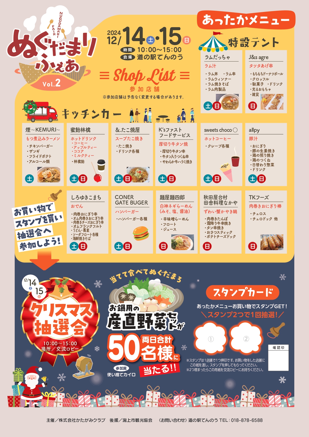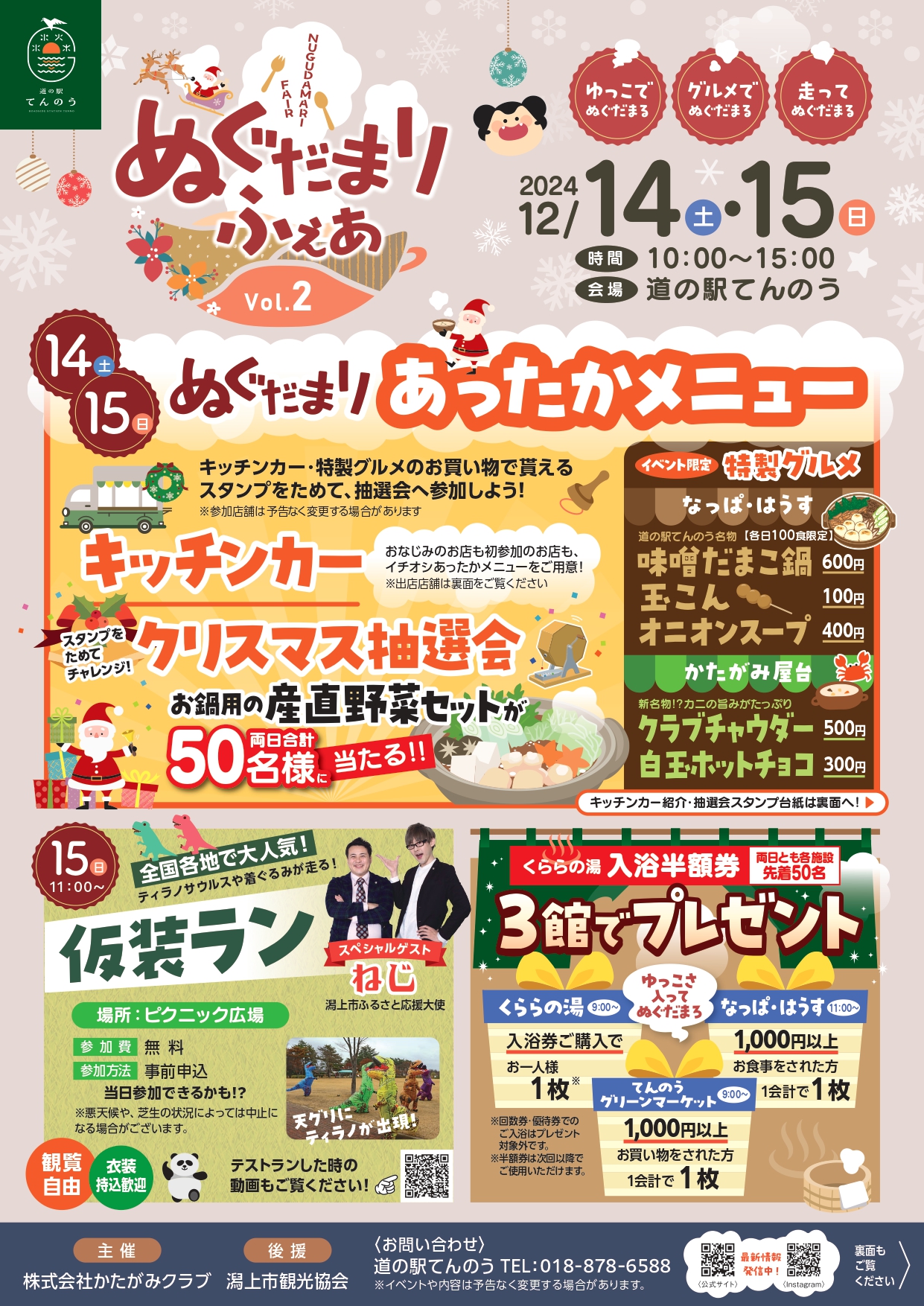 「心もからだも暖(ぬぐだ)まろう」をテーマに、道の駅レストランや人気キッチンカーのあったかメニューの提供や、「くららの湯」にお得に入浴できる特典など、他にも来客の皆様に楽しんでいただけるようなイベントを開催します🥳