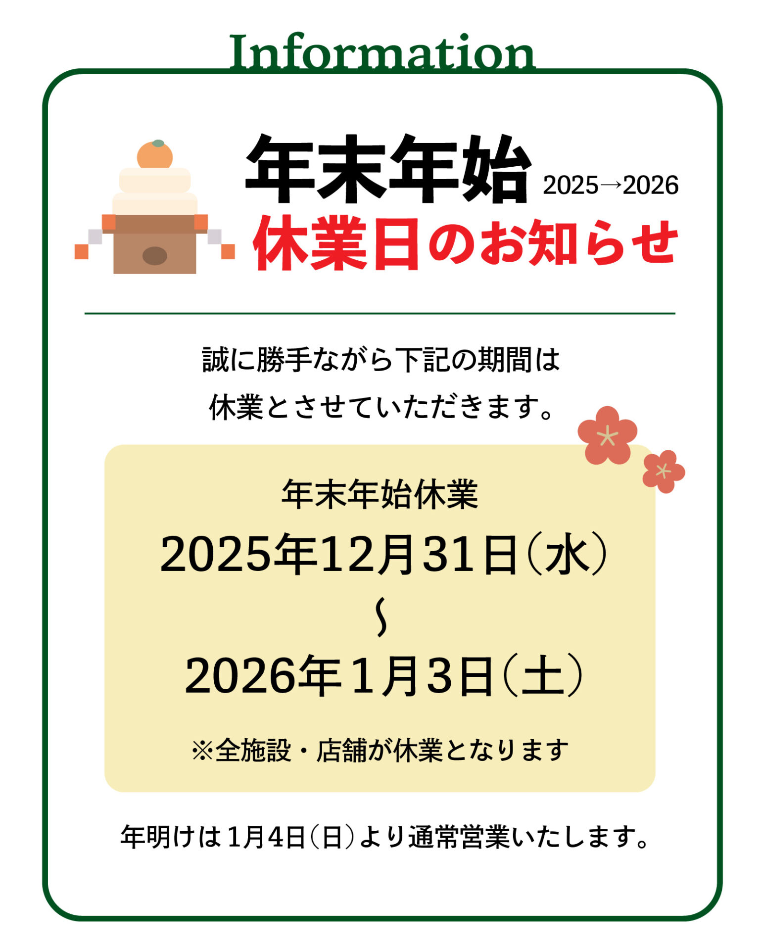 誠に勝手ながら下記の期間は全施設・店舗を休業とさせていただきます。