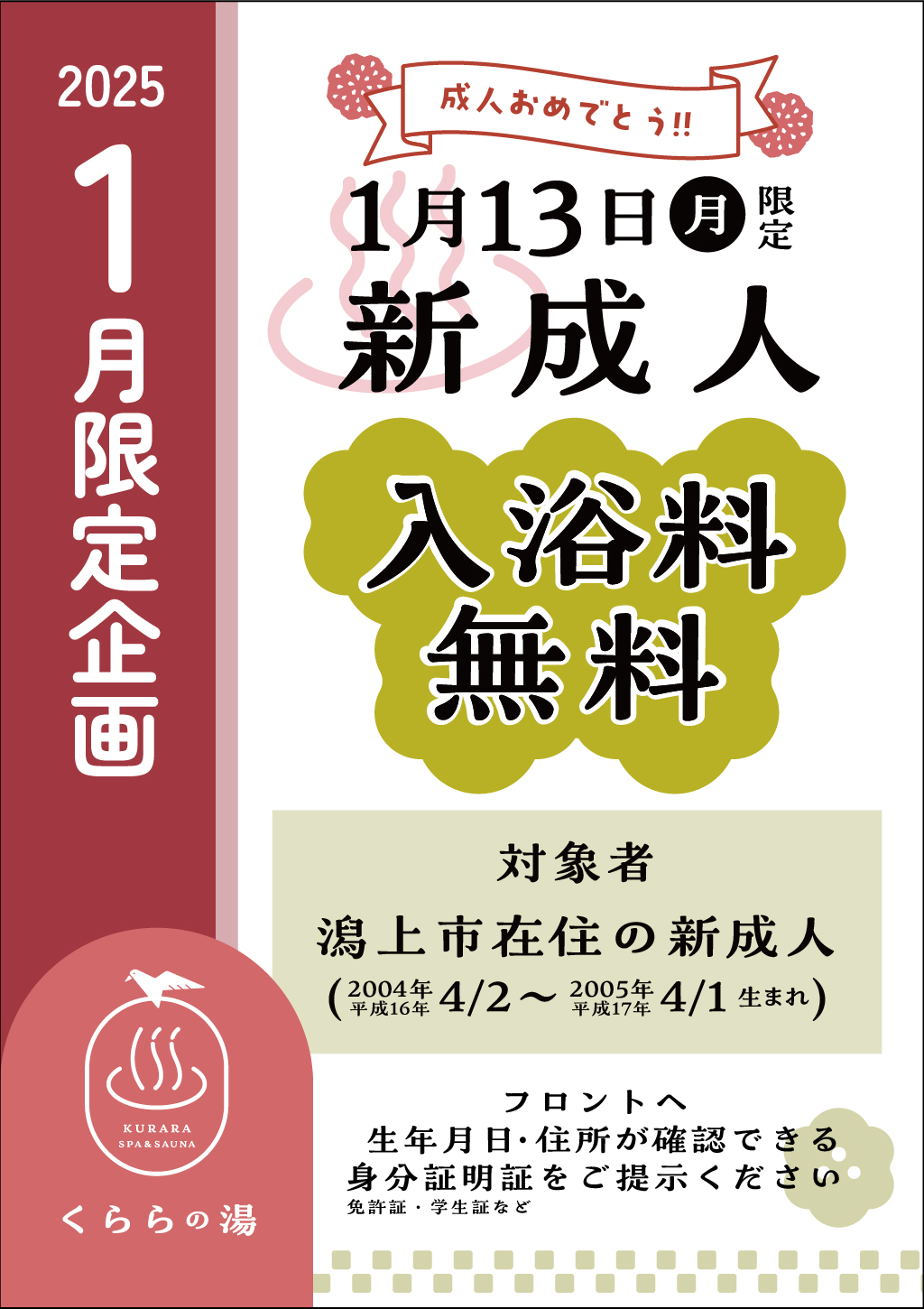 1月13日(月)に新成人限定で入浴が無料になります✨️