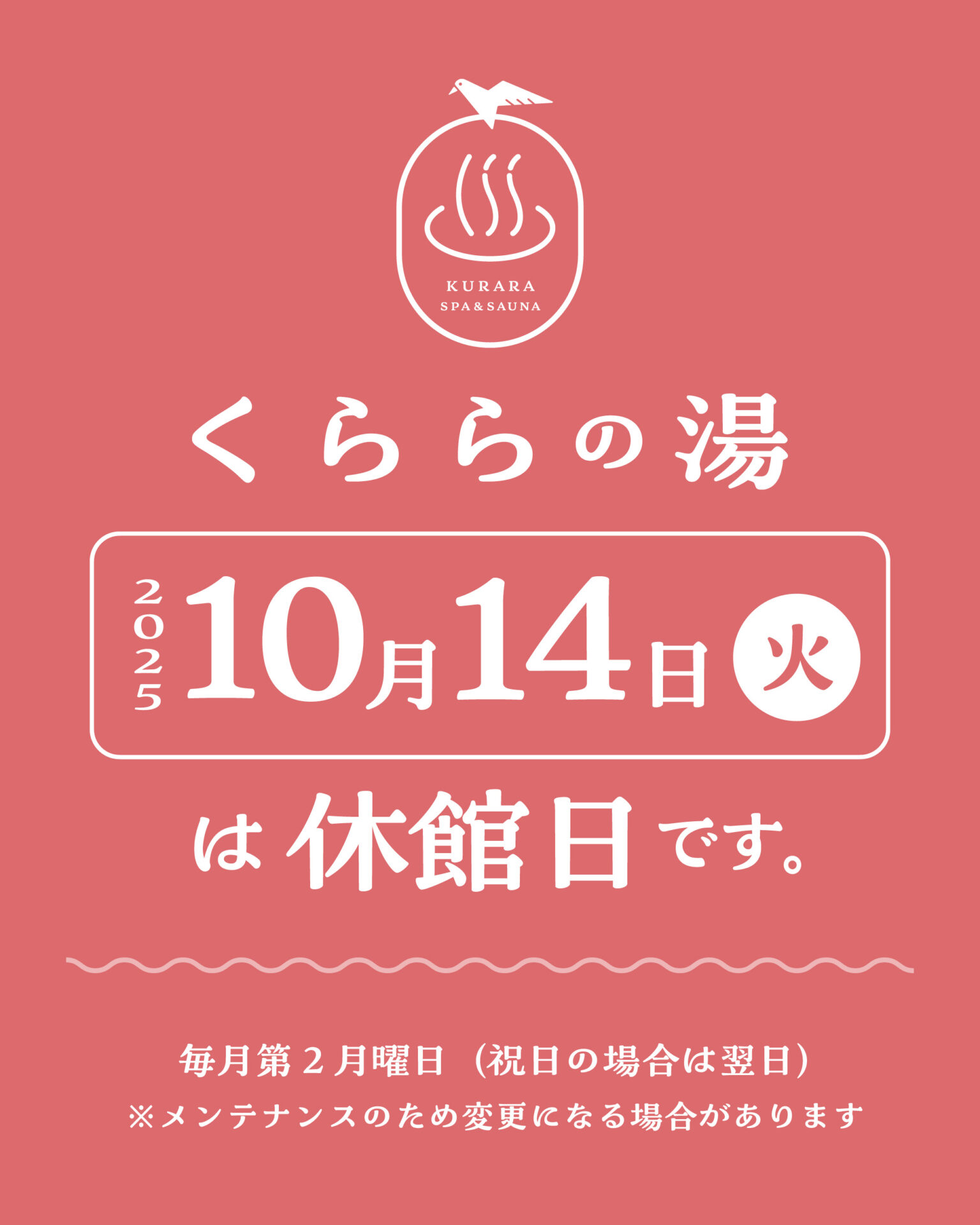 設備メンテナンスのため、📅10月14日(火)はくららの湯 休館日となります。(グリーンマーケット、スカイタワーは通常通り営業) ♨️10月15日(水)~通常営業いたします。 皆様のご来館をお待ちしております。===================== ♨️くららの湯 営業時間:9:00~21:00 (最終受付20:30)=====================