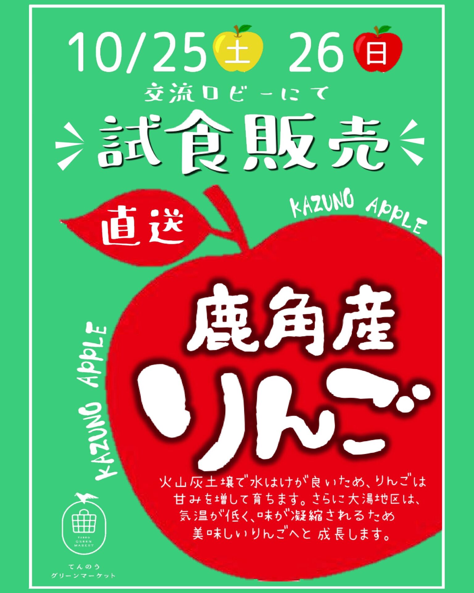 10/25(土)・26(日)の2日間、てんのうグリーンマーケット交流ロビーにて、秋田県鹿角地方のりんごを販売いたします!