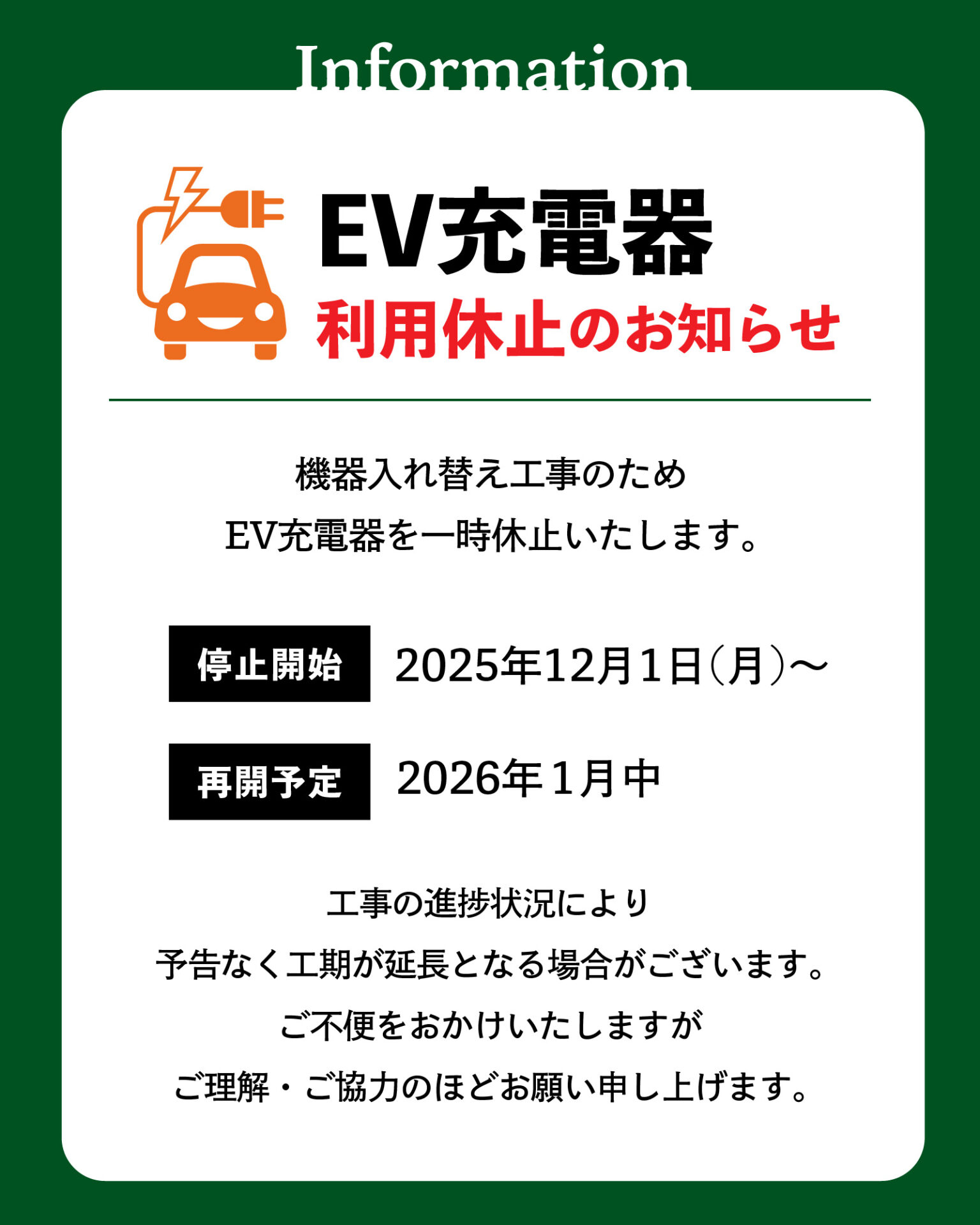 機器入れ替え工事のため、EV充電器を一時休止いたします。