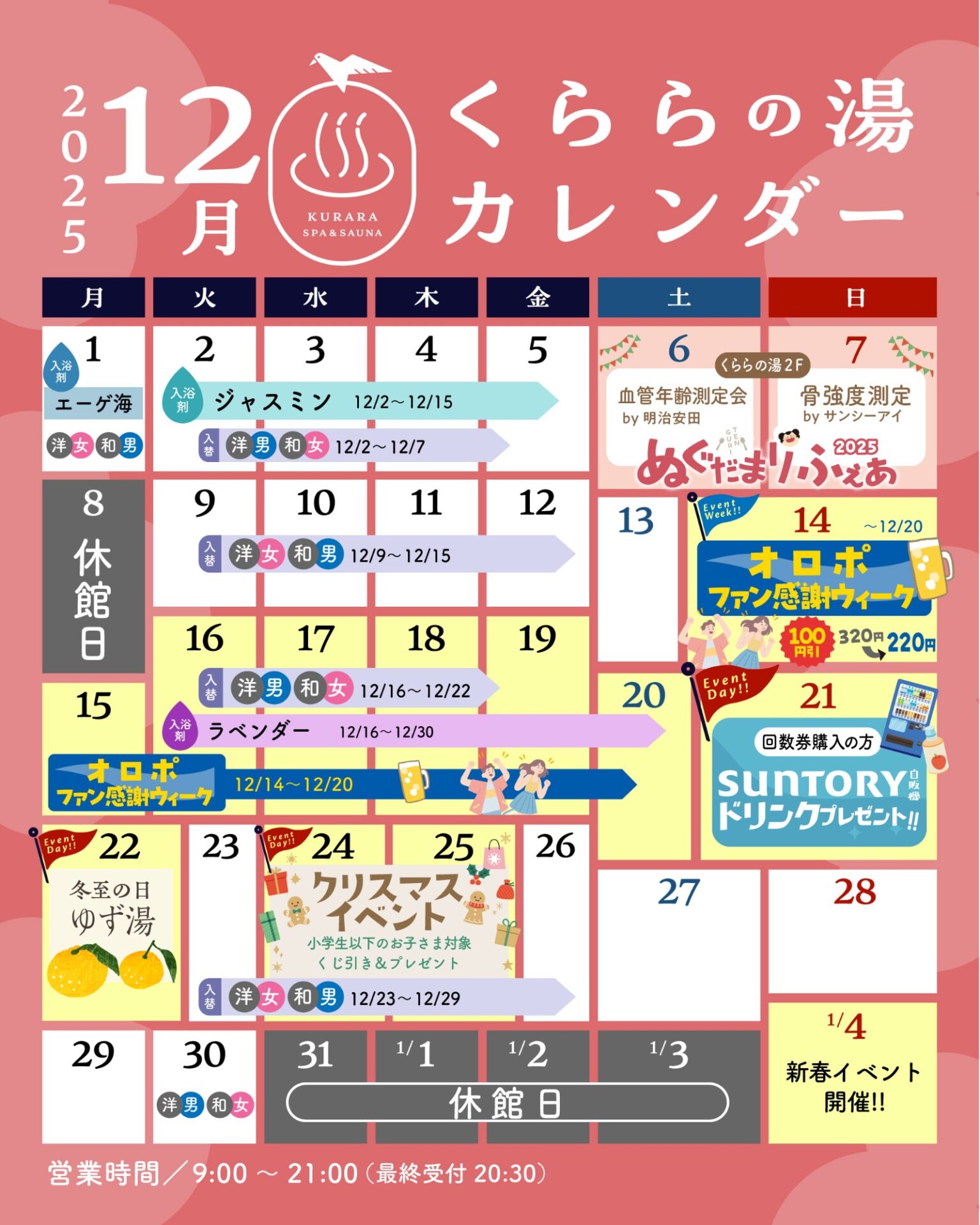 【くららの湯♨️】📢12月イベントカレンダー!✨ 📅 12/6(土)&12/7(日)は道の駅てんのう 🎪2025ぬくだまりふぇあ✨ くらら限定イベントはコチラ↓