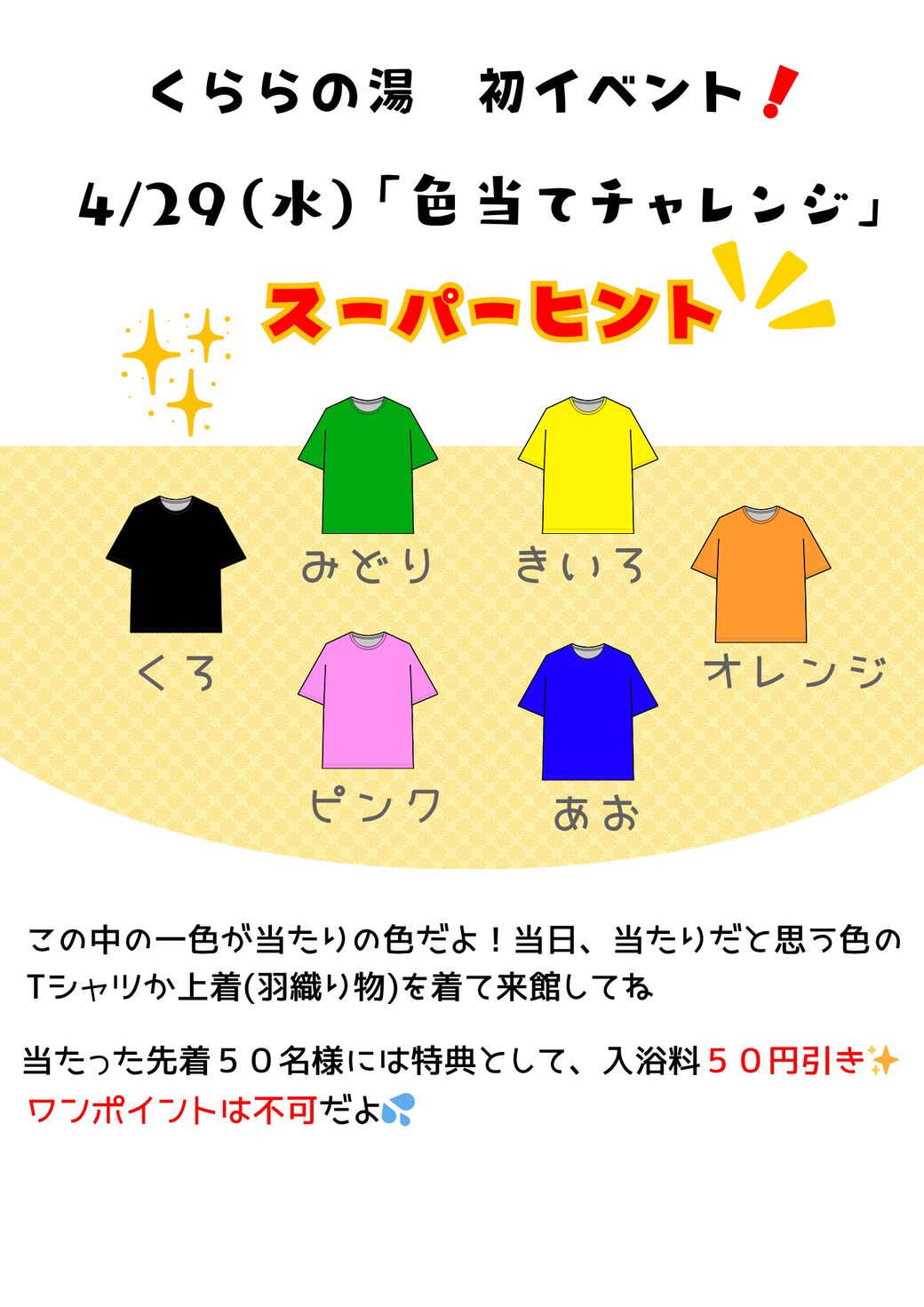 \くららの湯 初イベント🎉/4/29(水)開催✨🎨色当てチャレンジ🎨