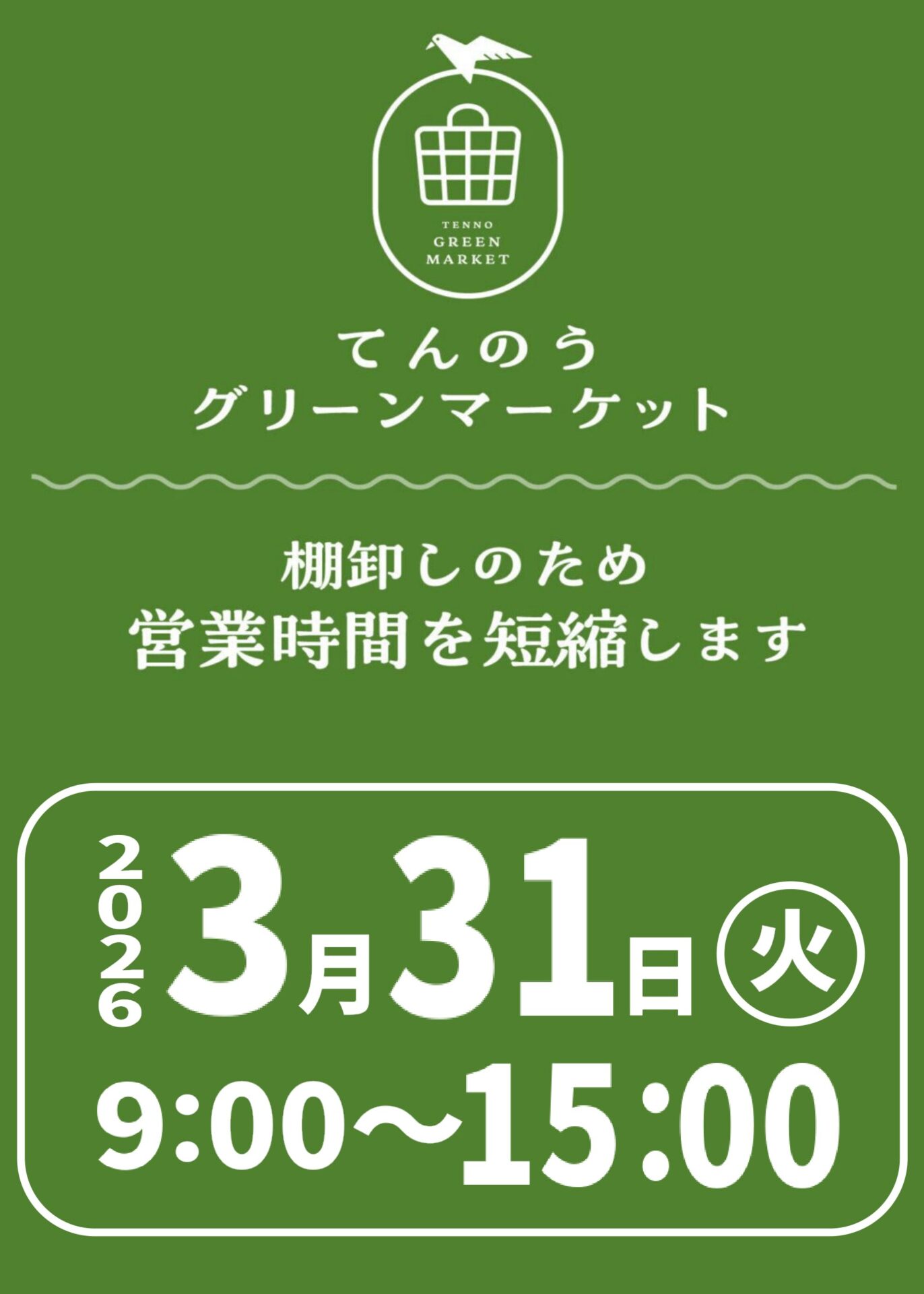 いつも道の駅てんのうをご利用いただきまして、誠にありがとうございます。誠に勝手ながら、以下の日時において、年度末棚卸し作業のため短縮営業を実施いたします。======================2026年3月31日(火)グリーンマーケット・・・9:00 ~ 15:00======================